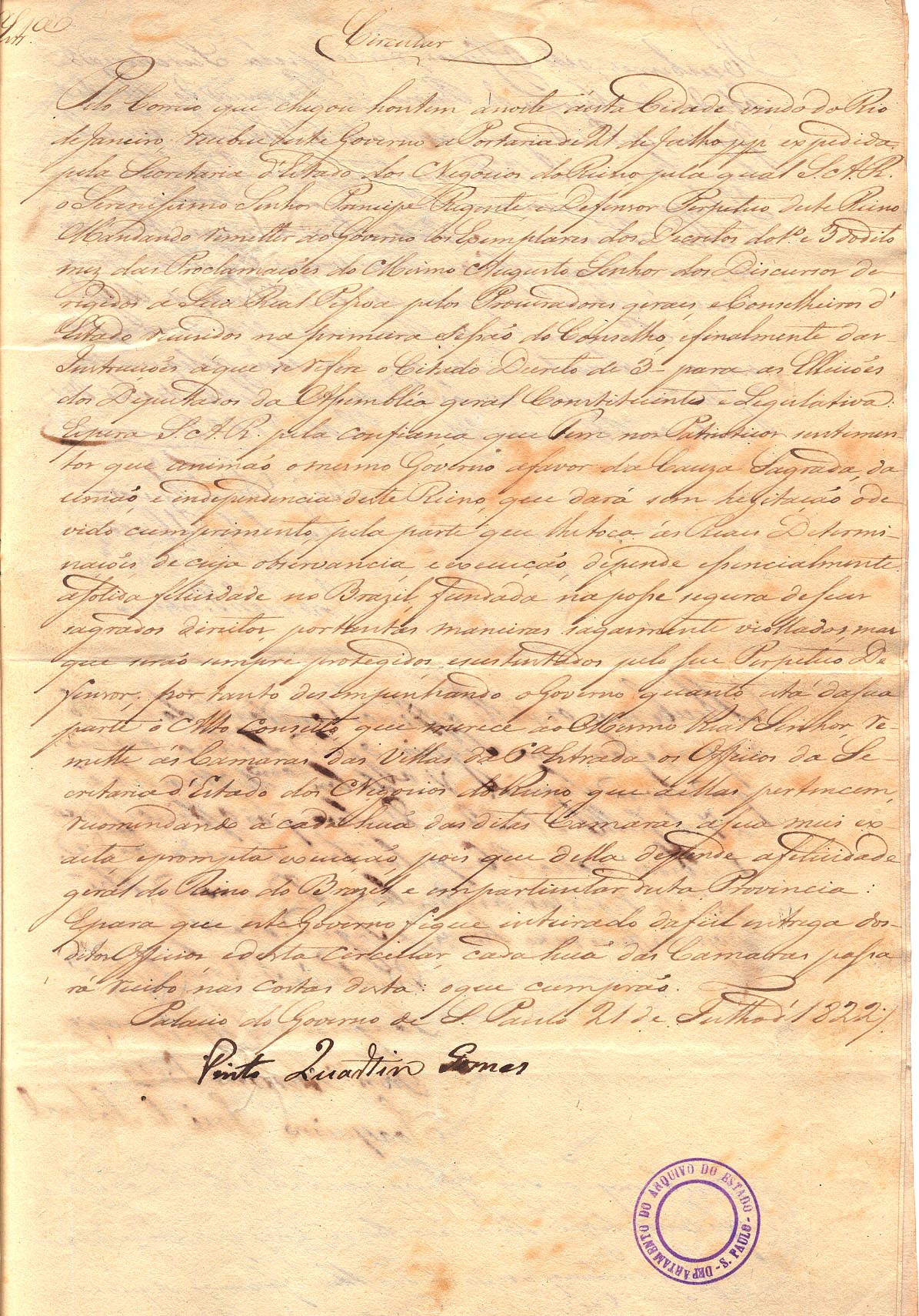 Pelo Correio que chegou hontem a noite a ésta Cidade vindo do Riode Janeiro; recebeu deste Governo a Portaria de 21 de Julho proximo passado expedidapela Secretaria d’ Estado dos Negocios do Reino (SPO, 1822, 245, 02).