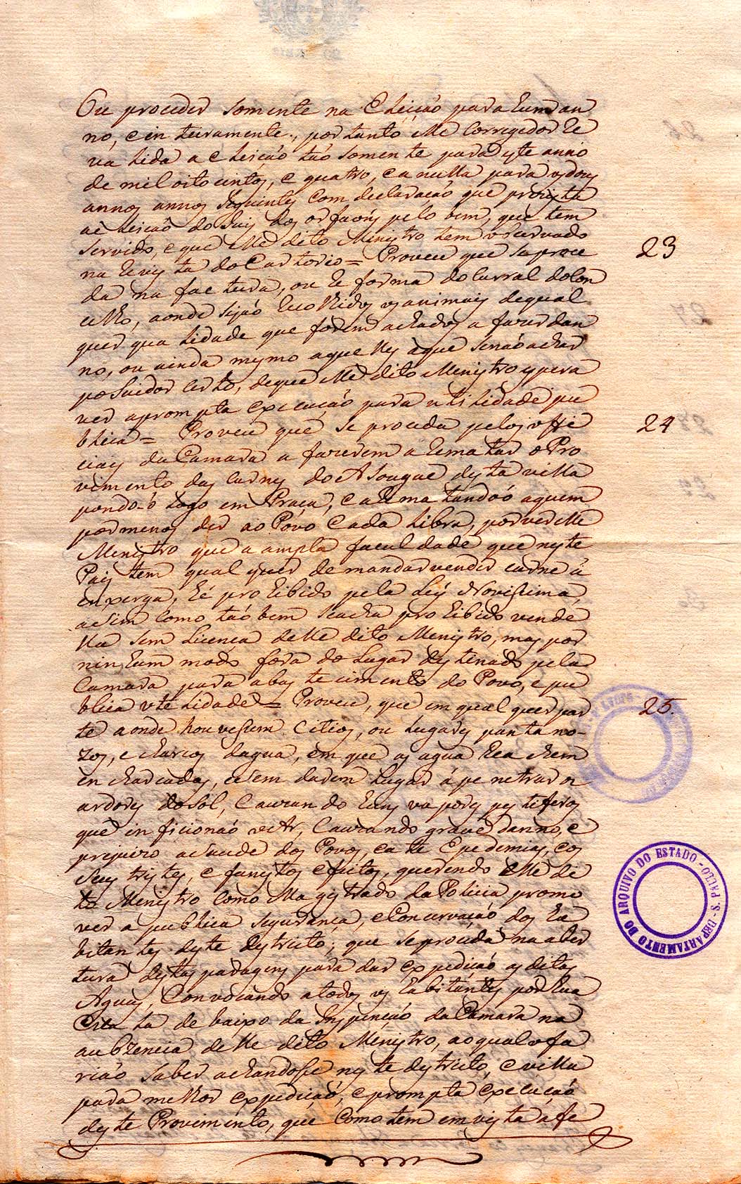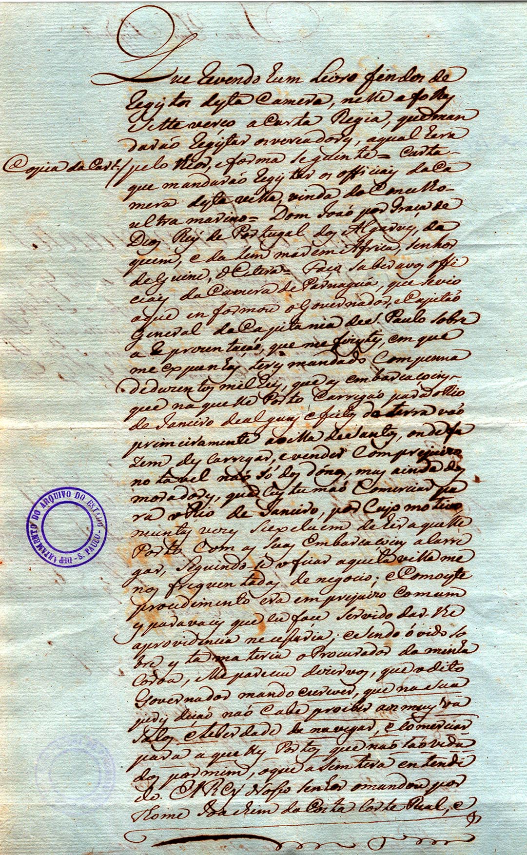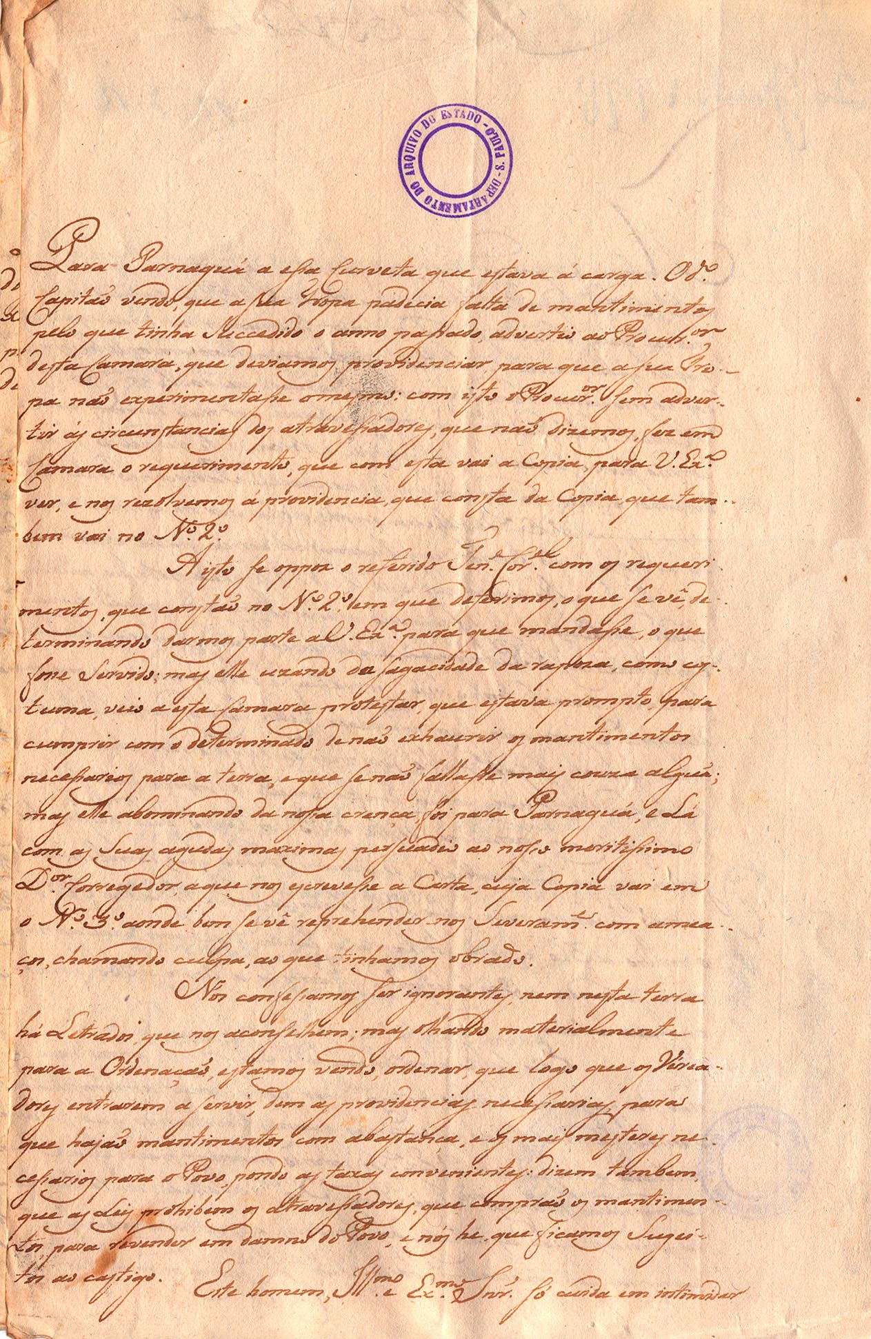 pello ditto caminho se há de fraquentar hé que há de pór esta Villa pupuloza ou aniquelalla porivindo se lhe Deus Guarde a Vossa Excelenca (ANT, 1798, 404, 15); Arros socado e com casca taboado de canela e peroba emquanto se naõ porebio cordas de embé agoasardentes de cana (ANT, 1798, 421, 05); Dizimos que de quase todo o povo ttem avençado a dinheiro, anttes seria notoria a injustissa o porhibirse aos mais, e tter o suplicantte só a liberdade dese monopollio (CTB, 1798, 650, 25); o contratador rematou naõ hé tinta deramada pello povo para se proebilhes o caminho de terra (ANT, 1798, 408, 21); finalmente outro edittal com as mesmas penas em que prohiba aos supplicantes (CTB, 1798, 072, 28); offisiais da camara fasaõ suas postturas, e acordaons com as penaz comvenientes, em que prohibaõ que por elle, senaõ leve gado vacum, e egoas (CTB, 1798, 062, 31); avista da provizaõ regia expedida pelo concelho ultramarino em que sua magestade prohibe aos parochos o levarem as conhecenças (CAS, 1803, 276, 16); estes moradores se consideraõ, a vista do que Vossa Excelencia determina aos parochos, e Sua Magestade lhes prohibe na dita provizaõ datada em 28 de Abril de 1730 (CAS, 1803, 278, 05); dizem também que as leis prohibem os atravessadores, que compraõ os mantimentos para revender sem danno do povo (CTB, 1798, 064, 28); tinha recebido hum officio do Illustrissimo e Excelentissimo Senhor Conde de Palma, em que prohibia a morador algum hir para fora desta Capitania sem despacho seo (PGA, 1818, 118, 11); elle sargento mor hé custumado andar diariamente munido com hua faca de Ponta prohibida nos nossos reinos pelas leis de Sua Alteza Real (GRT, 1803, 187, 22); a ampla faculdade que neste pais tem qualquer de mandar vender carne á enxerga, hé prohibido pela Ley Novissima (PGA, 1804, 501, 22); O Cappitam Mór da Villa de Paranaguá fez recolher todas as serras dos moradores desta villa e lhes prohibio o cortar, e serrar toda aqualidade de madeira (ANT, 1798, 400-401, 01); a dita sumaca Caregada com a farinha que pode leuar e az outras que câ estavam na mezma deligençia prohiuimos athe que aquella emgeitaçe carga (PGA, 1792, 591, 11); Senhor cuyas rezois nosos antesesores naõ prohiuiram o faiscar nas ditas minaz velhaz do destrito desta villa (PGA, 1721, 598, 03); Me pareceu dizervos, que o dito governador mando escrever, que na sua jurisdiçaõ naõ cabe proibir aos meus vasalos a liberdade de navegar (PGA, 1803, 707, 31).