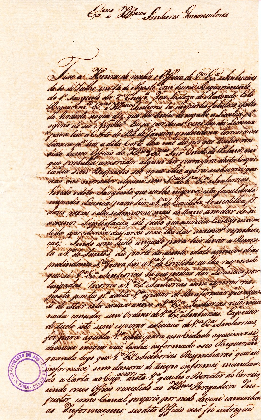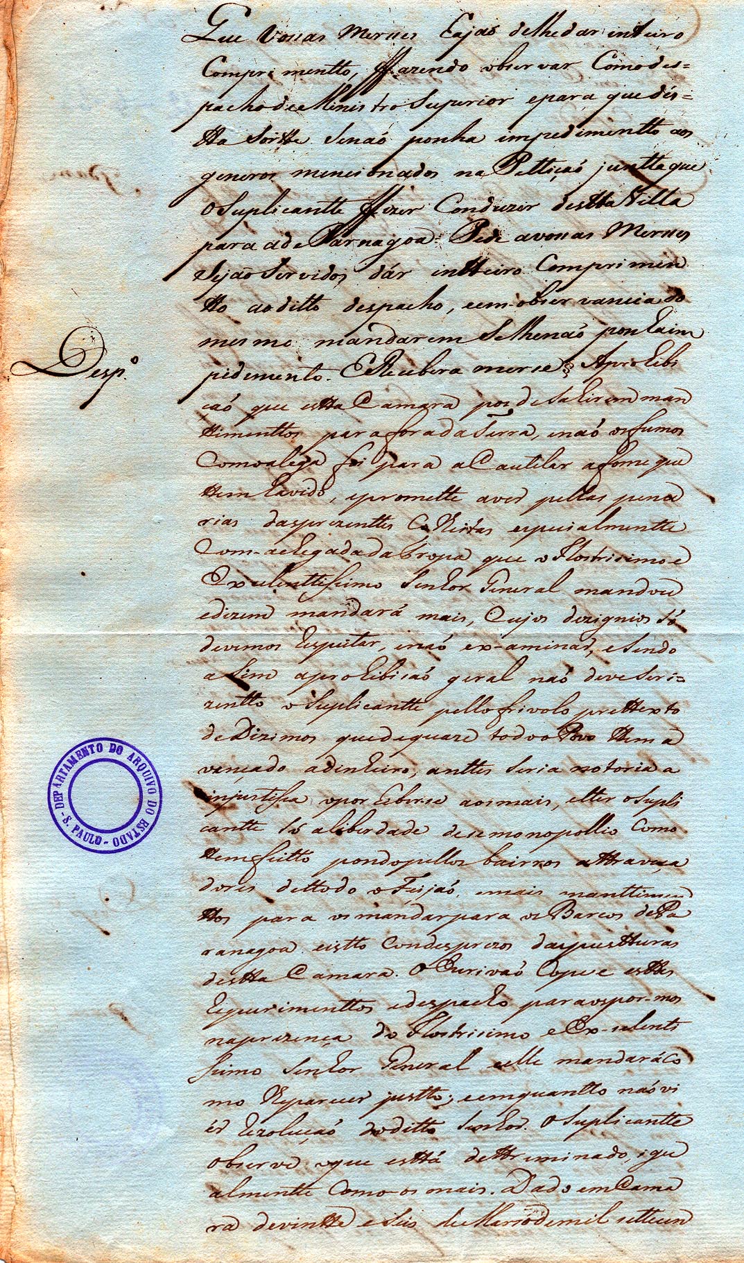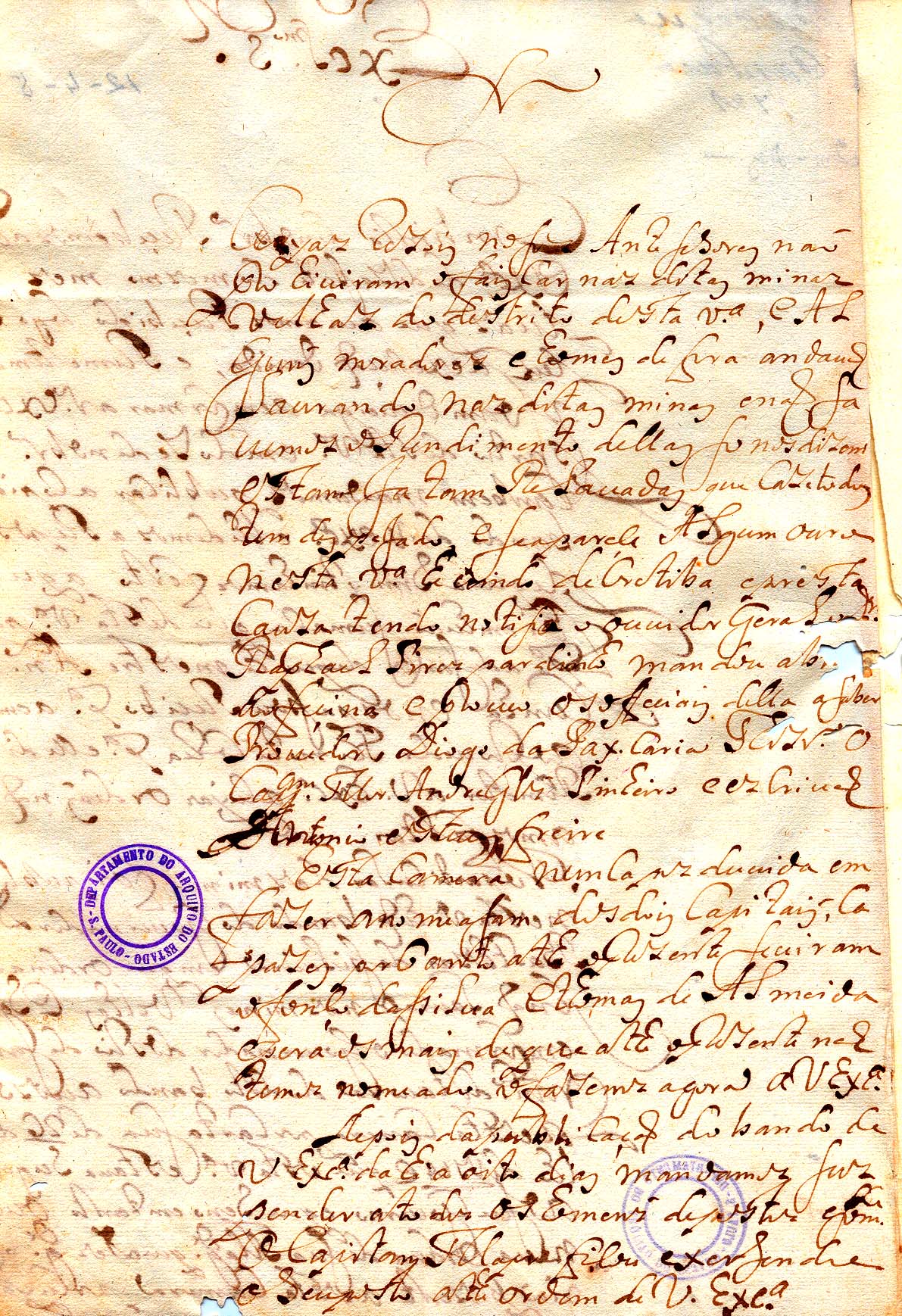 pello ditto caminho se há de fraquentar hé que há de pór esta Villa pupuloza ou aniquelalla porivindo se lhe Deus Guarde a Vossa Excelenca (ANT, 1798, 404, 15); Arros socado e com casca taboado de canela e peroba emquanto se naõ porebio cordas de embé agoasardentes de cana (ANT, 1798, 421, 05); Dizimos que de quase todo o povo ttem avençado a dinheiro, anttes seria notoria a injustissa o porhibirse aos mais, e tter o suplicantte só a liberdade dese monopollio (CTB, 1798, 650, 25); o contratador rematou naõ hé tinta deramada pello povo para se proebilhes o caminho de terra (ANT, 1798, 408, 21); finalmente outro edittal com as mesmas penas em que prohiba aos supplicantes (CTB, 1798, 072, 28); offisiais da camara fasaõ suas postturas, e acordaons com as penaz comvenientes, em que prohibaõ que por elle, senaõ leve gado vacum, e egoas (CTB, 1798, 062, 31); avista da provizaõ regia expedida pelo concelho ultramarino em que sua magestade prohibe aos parochos o levarem as conhecenças (CAS, 1803, 276, 16); estes moradores se consideraõ, a vista do que Vossa Excelencia determina aos parochos, e Sua Magestade lhes prohibe na dita provizaõ datada em 28 de Abril de 1730 (CAS, 1803, 278, 05); dizem também que as leis prohibem os atravessadores, que compraõ os mantimentos para revender sem danno do povo (CTB, 1798, 064, 28); tinha recebido hum officio do Illustrissimo e Excelentissimo Senhor Conde de Palma, em que prohibia a morador algum hir para fora desta Capitania sem despacho seo (PGA, 1818, 118, 11); elle sargento mor hé custumado andar diariamente munido com hua faca de Ponta prohibida nos nossos reinos pelas leis de Sua Alteza Real (GRT, 1803, 187, 22); a ampla faculdade que neste pais tem qualquer de mandar vender carne á enxerga, hé prohibido pela Ley Novissima (PGA, 1804, 501, 22); O Cappitam Mór da Villa de Paranaguá fez recolher todas as serras dos moradores desta villa e lhes prohibio o cortar, e serrar toda aqualidade de madeira (ANT, 1798, 400-401, 01); a dita sumaca Caregada com a farinha que pode leuar e az outras que câ estavam na mezma deligençia prohiuimos athe que aquella emgeitaçe carga (PGA, 1792, 591, 11); Senhor cuyas rezois nosos antesesores naõ prohiuiram o faiscar nas ditas minaz velhaz do destrito desta villa (PGA, 1721, 598, 03); Me pareceu dizervos, que o dito governador mando escrever, que na sua jurisdiçaõ naõ cabe proibir aos meus vasalos a liberdade de navegar (PGA, 1803, 707, 31).